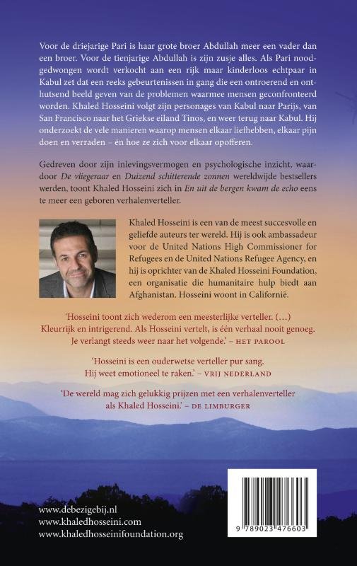 • Extra informatie: Voor de driejarige Pari is haar grote broer Abdullah meer een moeder dan een broer. Voor de tienjarige Abdullah is zijn zusje alles. Wat er met hen gebeurt – het zusje wordt noodgedwongen verkocht aan een rijk maar kinderloos echtpaar in Kabul – zet een reeks ingrijpende gebeurtenissen over tientallen jaren in gang, die een indringend beeld geven van de morele complexiteit van het leven. Hosseini beschrijft meerdere generaties in deze roman, ouders en kinderen en kleinkinderen, broers en zussen, en hij onderzoekt de vele manieren waarop familieleden elkaar liefhebben, verwonden en verraden – én hoe ze zich voor elkaar opofferen. Hij volgt zijn personages over de hele wereld: van Kabul naar Parijs, van San Francisco naar het Griekse eiland Tinos, en weer terug naar Kabul. Het verhaal wordt steeds groter en veelomvattender, emotioneler en krachtiger. Gedreven door zijn kenmerkende compassie en filosofische inzichten waardoor De vliegeraar een geliefde klassieker werd en Duizend schitterende zonnen een absolute bestseller, betoont Khaled Hosseini zich in En uit de bergen kwam de echo eens te meer een geboren verhalenverteller. Dit nieuwe boek is opnieuw een magnifieke prestatie.
